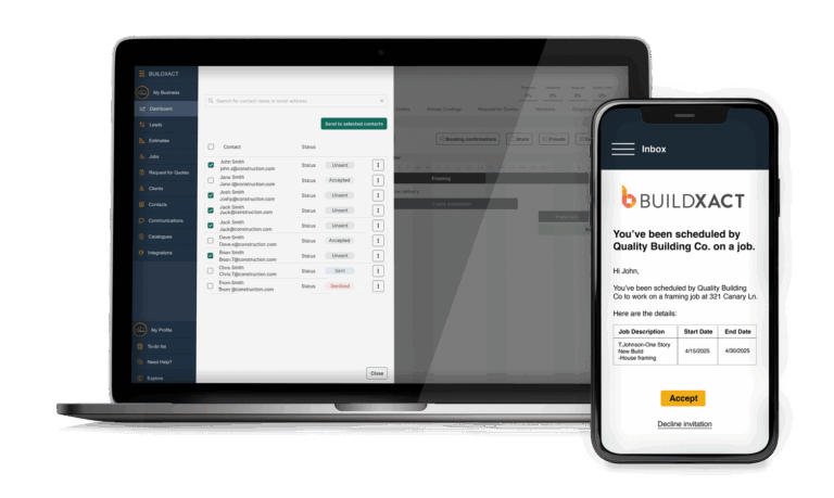 Never miss a beat from the job site again with Buildxact’s construction mobile app. Buildxact Onsite keeps projects at your fingertips, whether from your mobile device, tablet, laptop or desktop. On the job site or in the office, invite crew members to your project, follow their progress, and add updates on the fly—no matter when or where.